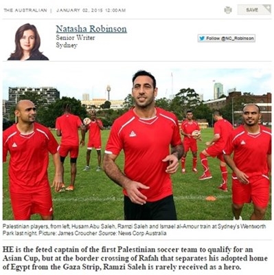 نشرت صحيفة "نهاية الأسبوع" الاسترالية، تقريراً مفصّلاً عن مشاركة منتخبنا الوطني في بطولة كأس الأمم الآسيوية للمرة الأولى في تاريخه، وأشارت الصحيفة إلى عدد كبير من الصعوبات التي تواجهها الرياضة الفلسطينية، ومنها "الحروب" التي راح ضحيّتها آلاف الشهداء.