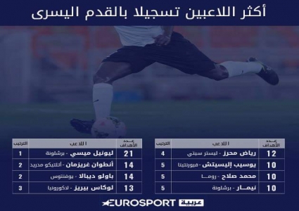 يتصدر الأرجنتيني ليونيل ميسي قائمة أكثر اللاعبين تسجيلا بالقدم اليسرى بعد إحرازه 21 هدفا به ثم يليه لاعب أتلتيكو مدريد أنطوان غريزمان وتواجد أيضا الجزائري رياض محرز والمصري محمد صلاح.من يستخدم قدمه اليسرى كثيرا يعد لاعبا مميزا فعلى مر التاريخ هناك أمثلة كثيرة لأساطير كانت مميزة باستخدام القدم اليسرى أمثال الأسطورة الأرجنتينية دييغو أرماندو مارادونا والرمز الهولندي يوهان كرويف وفي هذا التقرير عرض لأكثر اللاعبين تسجيلا للأهداف في الدوريات الأوروبية الكبرى باستخدام القدم اليسرى فقط. 1
